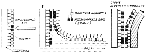 Рис. 10. Монослой амфифильного красителя при облучении электронами меняет свои оптические свойства за счет образования молекулярных пар – димеров. При переносе второго монослоя по методу Ленгмюра – Блоджетт новый слой формируется так, что напротив молекул-одиночек оказываются одиночки, а напротив пар – тоже пары. Отделив второй монослой от первого с помощью приложенной сверху полимерной пленки, получают точную копию информации, записанной электронным лучом.