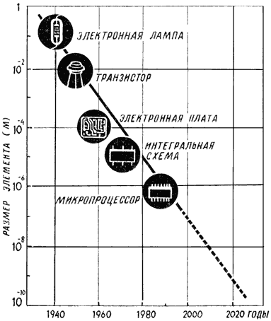 Рис. 12. Размеры вновь создаваемых электронных приборов со временем становятся все меньше и меньше и вскоре должны достичь масштабов, характерных для отдельных молекул.