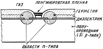 Рис. 13. «Искусственный нос» позволяет детектировать только те газы, молекулы которых избирательно пропускаются ленгмюровской пленкой к чувствительной поверхности полупроводникового транзистора. Изменяя структуру пленки, можно детектировать разные химические вещества.