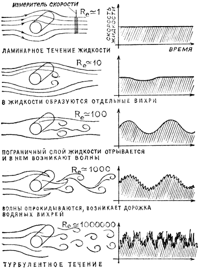 Так возникает турбулентность. Цилиндр обтекается потоком жидкости, например, движется в ней. Обтекание Удобно характеризовать «числом Рейнольдса» Re, которое пропорционально скорости течения и радиусу цилиндра. При малых числах Рейнольдса жидкость плавно обтекает находящееся в ней тело, а затем, по мере того как скорость течения возрастает, в жидкости образуются вихри. Чем выше скорость натекающего потока (больше число Рейнольдса), тем больше образуется вихрей и тем сложнее, запутаннее становятся траектории частиц жидкости. При развитой турбулентности скорость потока позади тела пульсирует непредсказуемым образом.