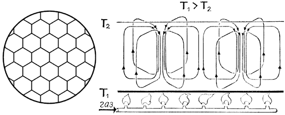 Конвективные ячейки Бенара. В 1900 году была опубликована статья французского исследователя Бенара с фотографией структуры, по виду напоминавшей пчелиные соты. При нагревании снизу слоя ртути, налитой в плоский широкий сосуд, весь слой неожиданно распадался на одинаковые вертикальные шестигранные призмы, которые впоследствии были названы ячейками Бенара. В центральной части каждой ячейки жидкость поднимается, а вблизи вертикальных граней опускается. Иными словами, в сосуде возникают направленные потоки, которые поднимают нагретую жидкость (с температурой T1 ) вверх, а холодную (с температурой T2 ) опускают вниз.