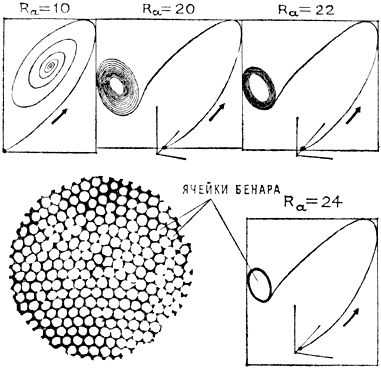 «Вращая» дальше ручку регулировки (Re≈10...20), мы приходим к неравновесному порядку с аттрактором типа устойчивого фокуса – это в вычислительном эксперименте, на экране дисплея или на графопостроителе. А в физическом эксперименте отчетливо наблюдаются ячейки Бенара.