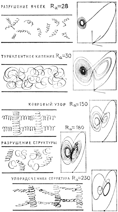 Интересна динамика процесса с ростом числа Рэлея. Расстояния между «оборотами» фазовой траектории (их обычно называют ветвями) постепенно сокращаются, и в конце концов изменяется характер аттрактора – фокус переходит в предельный цикл, который потому и называется предельным, что служит пограничной кривой между зонами устойчивости и неустойчивости; теперь даже при очень малом увеличении управляющего параметра начинают образовываться турбулентные вихри. Порядок переходит в хаос. В вычислительном эксперименте возникает неустойчивый фокус, а затем появляется странный аттрактор. В физическом эксперименте ячейки Бенара разрушаются, этот процесс напоминает кипение.
