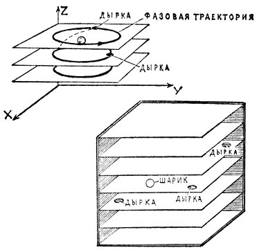 Странный аттрактор – абстрактное понятие, введенное для описания хаотического состояния. Универсального и наглядного образа странного аттрактора, к сожалению, не существует. Можно, однако, сконструировать детскую игрушку, представляющую собой многослойный лабиринт (трехмерное фазовое пространство), по которому бегает шарик (изображающая точка). В плоскостях между слоями имеются дырки, натыкаясь на которые шарик проваливается вниз. Однако эти дырки не находятся на одной вертикали, и поэтому шарик не может проскочить через всю структуру насквозь. Чтобы его траектория прошла с верхней плоскости до нижней, шарик должен описывать причудливые орбиты, пока не наткнется на отверстие, ведущее в соседнюю плоскость. Такая игрушка – грубая модель странного аттрактора.