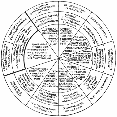 Хорошо известным примером использования перехода «хаос – порядок» служит лазер. Однако этот пример не единственный. На схеме представлены известные сегодня научные «зоны», в которых изучаются и наблюдаются переходы «порядок – хаос» и «хаос – порядок», в частности, самоорганизующиеся структуры (внешний круг). В среднем круге расположены эффекты и понятия, заимствованные синергетикой у смежных научных дисциплин, а во внутреннем круге различным секторам соответствуют те новые пути и закономерности, которые могут быть использованы в каждой данной области знания благодаря обобщениям, сделанным синергетикой.