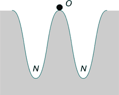 Рис. 3. Неустойчивое состояние равновесия (точка O). Флюктуация выводит шарик из равновесия; в точке M и N – устойчивое состояние равновесия.