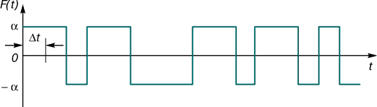 Флюктуации можно учесть, добавив в правую часть уравнения (2) случайные функции. Они могут отражать процессы, в детали которых на нашем уровне описания мы не вникаем. Отвлекаясь от их конкретного вида, приведем простейший пример случайной функции. Бросаем монету с интервалом времени Δt и считаем, что если в момент времени t выпадает орел, то F(t) = α, α << 1 δо момента t + Δt, если решка – F(t) = α; β момент времени t + Δt мы опять бросаем монету. Возможный вид функции, полученной таким образом, показан на рис.4. «Возможный» потому, что точно неизвестно, когда выпадает орел, а когда решка. Функция действительно случайная. И, бросая монету, читатели могут получить функцию нисколько не хуже нарисованной здесь.