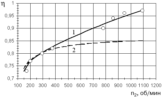 Рис. 2. Экспериментальные графики зависимости КПД от частоты вращения выходного вала: 1 – нового планетарного дискового прогрессивного вариатора; 2 – вариатора «Disco» фирмы «Lenze»
