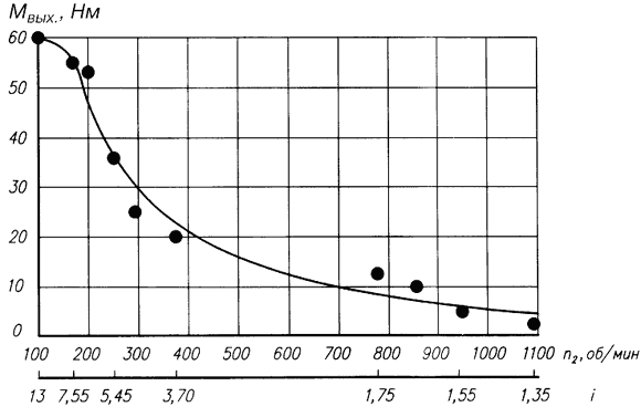 Рис. 6. Зависимость крутящего момента на выходе Мвых от частоты вращения выходного вала n2 и передаточного отношения i мотор-вариатора