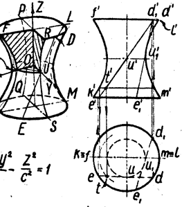 Плоскости XOZ и YOZ пересекают его по гиперболам FK, LM, PQ и RS, а плоскость XOY и ей параллельные – по окружностям (GU, FPLR и KQMS). При вращении точек D и Е их проекции d и е перемещаются по окружности, а проекции d и e – по прямым, параллельным оси Х. Точка U прямой DE, ближе других расположенная к оси вращения, описывает окружность UU1 наименьшего диаметра. Эту окружность называют горлом поверхности. Лучи, проектирующие какую-либо поверхность, касаются её в точках, образующих контурную линию . Соответствующая проекция этой линии называется очерком поверхности.