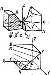 Плоскости XOZ и YOZ пересекают эту поверхность по параболам OD и OE; плоскости параллельные XOZ и YOZ ,также дают в сечении параболы; плоскость XOZ пересекает поверхность по двум пересекающимся прямым OL и OK, а плоскости, параллельные XOZ,- по гиперболам (EN и DM).