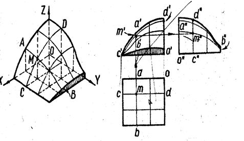На рис. 9 изображён объёмный график, используемый в радиотехнике. Поверхность определена кривыми линиями, одно семейство которых (CD) параллельно плоскости XOZ, а другое (АВ) – плоскости YOZ. Точка М поверхности определена как точка пересечения кривых АВ и CD.