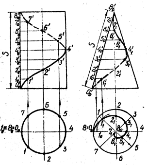 1. Конус образуют вращением прямой OD вокруг пересекающейся с ней оси Z (рис. 2, а). Координатные плоскости XOZ и YOZ рассекают конус по пересекающимся прямым OD, OE, OK и OF; плоскость XOZ даёт в сечении точку О; плоскость , параллельная XOY, пересекает по окружности (DFEK).