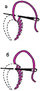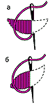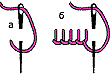 Нить выводят на лицевую сторону в нижней точке шва, затем делают стежок иглой в направлении сверху вниз (нить при этом остается под иглой) и затягивают рабочую нить до образования петли (см. рис. а). На рис. б) стежки шва расположены на некотором расстоянии друг от друга.