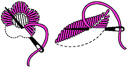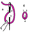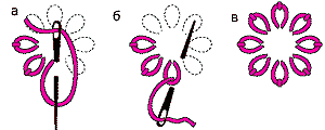 Шов состоит из ряда отдельных петель, расположенных по узору. Чтобы выполнить петлю, нитку закрепляют на изнаночной стороне, выводят на лицевую сторону в точке 1 и отводят вниз, придерживая большим пальцем левой руки. Затем из точки 2 в точку 3 делают стежок, равный длине петли (рис. а). Полученную петлю закрепляют небольшим стежком в точке 4 (рис. б). На нижнем рис. показана последовательность выполнения цветка швом «петля вприкреп».