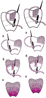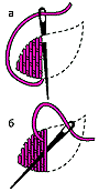 Шьется большими стежками, идущими от края к центру контура и обратно. Последовательность исполнения шва: закрепите нить на лицевой стороне, в нижней части обшиваемого контура. Затем сделайте небольшой стежок вверху контура (рис. а) и затяните нить до образования гладьевого стежка. Аналогичным образом сделайте маленький стежок внизу контура рисунка (рис. б) и т.д.