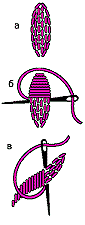 Выполняется по предварительно проложенному настилу, чтобы вышивка получилась более выпуклой, рельефной. Настил обычно прокладывается нитками более толстыми, чем рабочие (см. рис. слева, а).