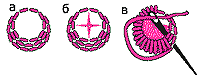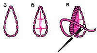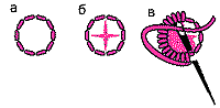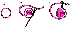 Часто встречаются кружочки, обшитые с одной стороны утолщенным настилом глади. В этом случае с утолщенной стороны кружок обшивают швом вперед иголку не в один, а в два-три ряда (рис. а) и затем выполняют вышивку, начиная с узкой части кружка (рис. в).