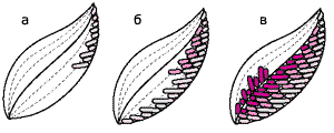 Начинают вышивку с крайней (самой светлой) части в направлении сверху вниз (рис. а). Стежки по краям более короткие, к центру листика более длинные. Вторую и третью части вышивают также сверху вниз (рис. б), только цвет ниток берется темнее. Вторую (левую) половинку листика вышивают аналогично, только в направлении снизу вверх и от центральной (более темной) части к наружной (более светлой) (рис. в).