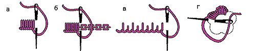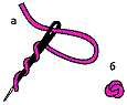 Выводят нить на лицевую сторону, левой рукой делают 2–3 навивают нити на иголку и выводят иголку на изнаночную сторону рядом с первым проколом (рис. а). При этом нить на иголке нужно придерживать пальцем левой руки до тех пор, пока на ткани не образуется затянутый узелок (рис. б). Шов декоративный, им выполняют тычинки цветов, серединки цветов и другие элементы.