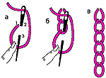 Это глухой односторонний шов, он состоит из ряда петель, выходящих одна из другой, и по лицевой стороне напоминает цепочку, связанную крючком. Вышивают его сверху вниз, справа налево и по контуру рисунка. Последовательность выполнения шва показана на рис. Итак, выводят нить на лицевую сторону в точке 1 и отводят ее вниз, придерживая большим пальцем левой руки. Затем из точки 2 в точку 3 движением иглы сверху вниз делают стежок (рис. а) и затягивают нить, образуя 1-ю петлю. Последующие петли выполняются аналогично (рис. б), таким образом образуется шов «цепочка» (рис. в). Им можно вышивать как прямые контуры, так и криволинейные.