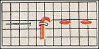 5. Выкалывайте иглу на 4–5 нитей ткани ниже первой петли так, чтобы петля из рабочей нитки была под иглой. 6. Так вышивают по прямой линии, отсчитывая одинаковое число нитей ткани для каждого стежка.