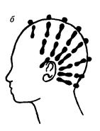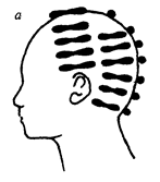 Рис. 1.1. Схема горизонтального накручивания волос при химической завивке: а) перекрестная; б) параллельная.