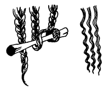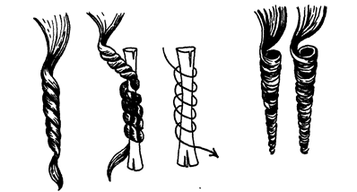 Закручивать волосы начинают с макушки, отделяя прядь за прядью, тщательно их расчесывая и ставя перпендикулярно голове. Прядь должна быть не очень тонкой, примерно по толщине коклюшки. Хорошо натягивают прядь, берут ее, не собирая в пучок, и лентообразно закручивают на коклюшку.