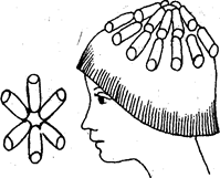 Шапочку можно сделать из полиэтилена. Взять пакет или резиновую шапку для купания, вырезать отверстия, или взять шапочку для мелирования волос. Надеть на голову. Крючком через отверстия вытянуть тонкие пряди волос или использовать для этой цели хвостик расчески. Накрутить по 2– 3 пряди на коклюшки одинакового или разного диаметра (рис. 2.5, 2.6).
