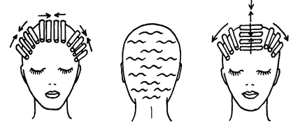Приступая к накручиванию волос, часто выбирают одну из нескольких схем расположения и направления коклюшек. Чаще всего применяются (рис. 1.1) перекрестная схема (средний ряд – назад, остальные – в сторону) и схема параллельного накручивания назад. Эффект накручивания волос может быть и неплохим, но он никогда не сможет сравниться с результатом продуманного, планомерного накручивания применительно к выбранной линии прически и индивидуальным чертам лица клиентки.