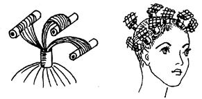 Чтобы улучшить, увеличить объем волос, отделяют пряди через определенные интервалы – 3–4 см. Прямые пряди или скрученные в жгутик наматывают на коклюшку по спирали (рис 2.8, 2.9). Такая техника предназначена для получения модных эффектов или увеличения объема при тонких волосах. Между коклюшками оставляют прямые пряди, улучшается динамика волос и устойчивость структуры волос в прическе.