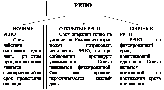 РЕПО делятся на три вида в зависимости от срока действия: ночные (на один день), открытые (срок операции точно не установлен), срочные (более чем на один день, с фиксированным сроком, например, семь дней). Необходимо отметить, что со срочностью РЕПО связана и ставка. Именно поэтому представляется целесообразным объединить эти характеристики при описании операции РЕПО. Краткая характеристика каждого из видов представлена на рис.1.1.
