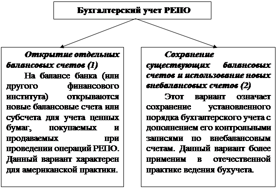 Отличительной чертой второго варианта также является то, что ценные бумаги действительно уходят с баланса банка продавца. Тем самым бухгалтерский учет закрепляет переход права собственности от одной стороны к другой, что отвечает принципам отечественного бухгалтерского учета. По этой причине второй вариант в большей степени применим к постепенно развивающемуся в России рынку РЕПО.