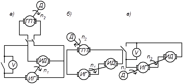 При использовании способа параллельного включения источника электрической энергии обе машины — двигатель ИД и генератор ИГ (рис.1, а) соединяются друг с другом механически и к ним подводится питание от генератора постоянного тока ГПТ требуемого напряжения, приводимого во вращение двигателем Д. Цепи возбуждения всех трех машин постоянного тока включены независимо от якорных цепей и на рис.1 не показаны.