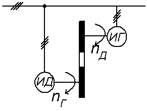 Испытуемые двигатель ИД и генератор ИГ включены на общую сеть (рис. 2). Их роторы связаны ременной передачей, так что частота вращения двигателя яд оказывается меньше, а частота вращения генератора пГ больше синхронной. При этом мощность генератора в рассматриваемой схеме меньше мощности двигателя на сумму потерь. В результате при номинальной нагрузке генератора ИГ двигатель ИД оказывается перегруженным, а при номинальной нагрузке двигателя нагрузка генератора меньше номинальной.