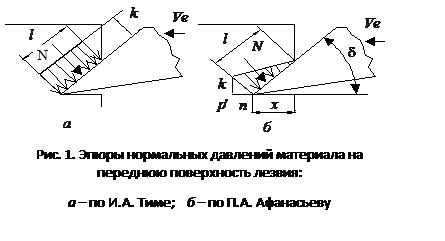 В отличие от И.А. Тиме П.А. Афанасьев считал, что давление обрабатываемого материала на переднюю поверхность распределено неравномерно, и что наибольшее давление имеет место у режущей кромки, а в точке входа в древесину оно равно нулю. Давление от нуля до максимума изменяется по линейной зависимости, поэтому эпюра нормальных давлений имеет форму треугольника (рис. 1, б ).