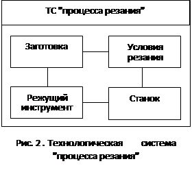 Резание древесины – сложный процесс. При изучении такой процесс в современных условиях принято рассматривать как технологическую систему (ТС), состоящую из нескольких взаимосвязанных и относительно неделимых частей, образующих единое целое. Технологическая система "процесс резания" состоит из четырех частей, называемых подсистемами (рис. 2): заготовки, условий резания, станка, режущего инструмента.