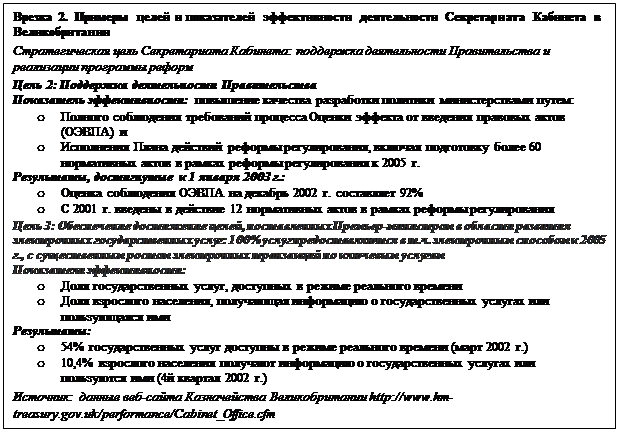 Необходимо отметить, что показатели государственного управления «второго поколения» существенно варьируются по времени, когда эффект от преобразований становится очевидным, а также по степени внешнего воздействия: в то время как в краткосрочном плане реформы государственного управления незначительно влияют на показатели качества государственных услуг, некоторые «внутренние» показатели эффективности (связанные с численностью, финансированием и т.п.) отражают преобразования в сфере государственного управления достаточно быстро, однако являются менее значимыми для общества в целом. На уровне конкретных стран показатели эффективности государственного управления, как правило, носят «целевой характер» и привязаны к достижению национальных приоритетов в сфере предоставления определенных государственных услуг или совершенствования процедур и процессов деятельности государственных органов. В Великобритании достижение таких приоритетов выражено в определенном перечне целевых показателей, ответственность за выполнение которых несут определенные ведомства. Примеры целей и показателей эффективности в области развития государственного управления, закрепленных за Секретариатом Кабинета приведены во Врезке 2. Интересна также практика контроля за достижением утвержденных целевых показателей. Например, в Великобритании из всех целевых показателей эффективности (свыше 100), по усмотрению Премьер-Министра отбираются 30 – 40 наиболее значимых показателей эффективности, контроль за достижением которых возлагается на Отдел по обеспечению эффективности деятельности. Затем ведомства, отвечающие за достижение приоритетных показателей совместно с сотрудниками данного отдела разрабатывают план по достижению поставленных результатов, определяющий как необходимые мероприятия по достижению цели, так и промежуточные значения приоритетных показателей, зависящие от скорости наступления отдачи от предпринятых мероприятий. Отдел по обеспечению эффективности деятельности осуществляет периодический мониторинг выполнения данного плана, сравнивая динамику (траекторию