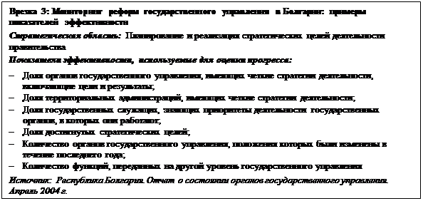 на измерение прогресса в реализации определенных программных мероприятий и достижении целей преобразований. В Болгарии такие показатели эффективности были разработаны на основе «Стратегии государственного управления – от