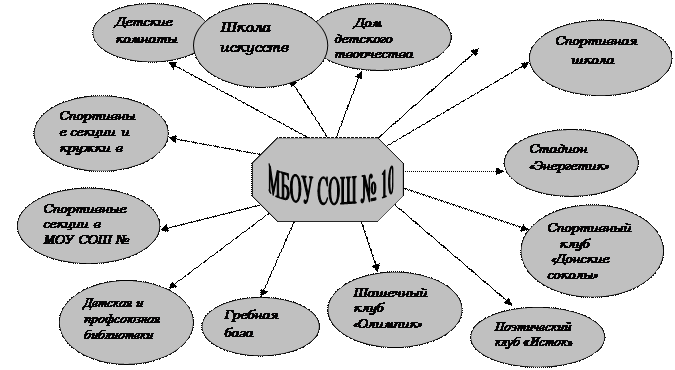 МБОУ СОШ № 10 расположена в микрорайоне Донской г.Новочеркасска и функционирует с 1974 года. Донской – поселок энергетиков Новочеркасской ГРЭС . которая является крупнейшей электростанцией Дона. В микрорайоне школы функционируют общеобразовательная школа № 23, три дошкольных учреждения № 61,64,54, широкая сеть учреждений дополнительного образования, культуры и спорта: школа искусств, Дом детского творчества, детско-юношеская спортивная школа № 3, ДК «Энергетик», стадион «Энергетик» с городошным кортом, спортивный клуб «Донские соколы» (баскетбол, дзюдо, атлетическая гимнастика, современный тренажерный зал, секция военно-патриотического воспитания «Барс», секция «кекушинкай»), Центр водных видов спорта (академическая гребля на байдарках и каноэ), детская профсоюзная библиотека, детские комнаты, творческий клуб «Взлет», шашечный клуб «Олимпик», Детский оздоровительный центр, бассейн. Слаженное взаимодействие всех структур микрорайона позволяет реализовывать проекты и программы, направленные на создание благоприятной среды для физического и нравственного развития детей, подростков и молодежи, пропаганде здорового образа жизни. Многолетнее неослабевающее внимание руководства Филиала ОАО «ОГК-6» Новочеркасская ГРЭС к развитию спорта, образования, культуры в жилом микрорайоне энергетиков позволили Донскому не попасть в печальную статистику рабочих поселков области, в которых наркомания и подростковая преступность имеют критические показатели.