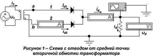 2 Нагрузка подключена непосредственно к выпрямителю. Неисправный диод заменен на новый (в схеме 2 диода). Величина сопротивления нагрузки выбрана такой, чтобы выделяемая в ней активная мощность была той же, что и в 1-ом опыте. В этом случае действующее значение тока вторичных обмоток трансформатора составляет 0,6 А.