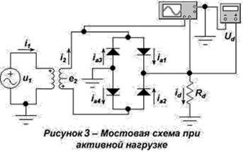 Нагрузка с чисто активным регулируемым сопротивлением питается от однофазного неуправляемого мостового выпрямителя. Частота питающей сети 50 Гц. Максимальное обратное напряжение на диодах 50 В.