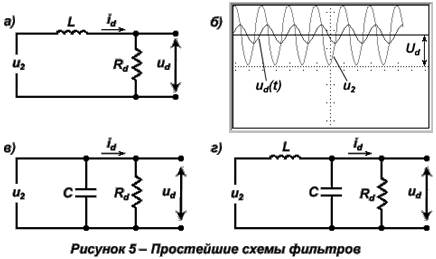 3 В схем 4 диода. Индуктивность фильтра такова, что амплитуда основной гармоники пульсаций тока нагрузки составляет 100 мА.