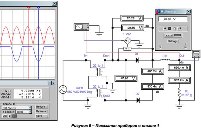 2 Нагрузка подключена к выпрямителю через L-фильтр. Неисправный диод заменен на новый (в схеме 2 диода). Индуктивность фильтра такова, что пульсациями тока нагрузки можно пренебречь. Величина сопротивления нагрузки выбрана такой, чтобы выделяемая в ней активная мощность была той же, что и в 1-ом опыте. Среднее значение тока диодов составляет 0,6 А.