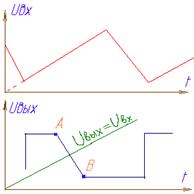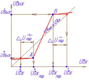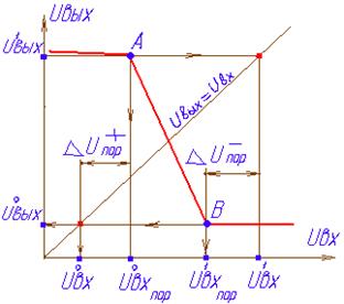 На передаточной характеристике намечаются точки А и В, в которых касательные к графику идут под углом ±45°, т.е. где dU вых/ dU вх = ±1 и эти точки проектируются с использованием нанесенной на график линии равного усиления U вых= U вх на оси абсцисс и ординат