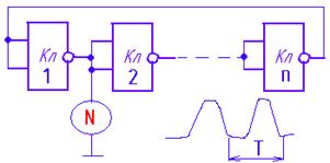 Для оценки t зд.р.ср. собирают цепочку из нечетного числа исследуемых инвертирующих схем и закольцовывают её (рис. 18).