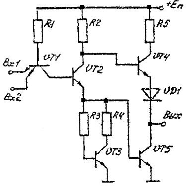 составляет при этом не более 0,3В. Потенциал базы VT2 , равный Uº вх + U к.э.н1 , недостаточен для открывания двух последовательно включенных эмиттерных переходов транзисторов VT2 и VT5 , а вместе с ними заперт и транзистор VT3 .