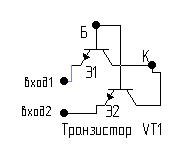 В библиотеке EWB -5.12 pro. многоэмиттерного транзистора нет ,его создают из нескольких n-p-n транзисторов ,объединяя их базы и коллекторы.(см. рис. )