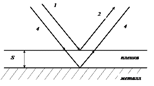 Пусть два луча проходят сквозь прозрачную пленку на поверхности металла, отражаясь один от внешней поверхности пленки (рисунок 1.1, линии 1, 2), другой - непосредственно от поверхности металла, пройдя через нее (рисунок 1.1, линии 3, 4).