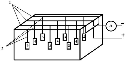 4.4.5 Подготовить гальваническую ванну: зачистить наждачной бумагой держатели для образцов, расположенные на штангах; промыть в воде аноды и завесить их в ванну по 3 шт. на каждую анодную штангу; закрепить стальные образцы и собрать электрическую схему (рисунок 4.1).